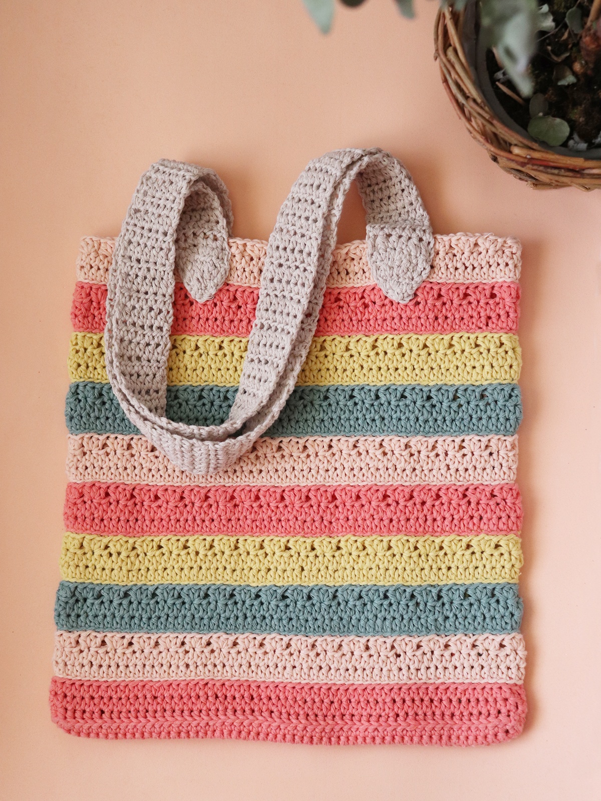 A colorful striped crochet tote bag with beautiful fan stitch texture, soft structure, and crocheted handles — a relaxing and satisfying make for everyday use.